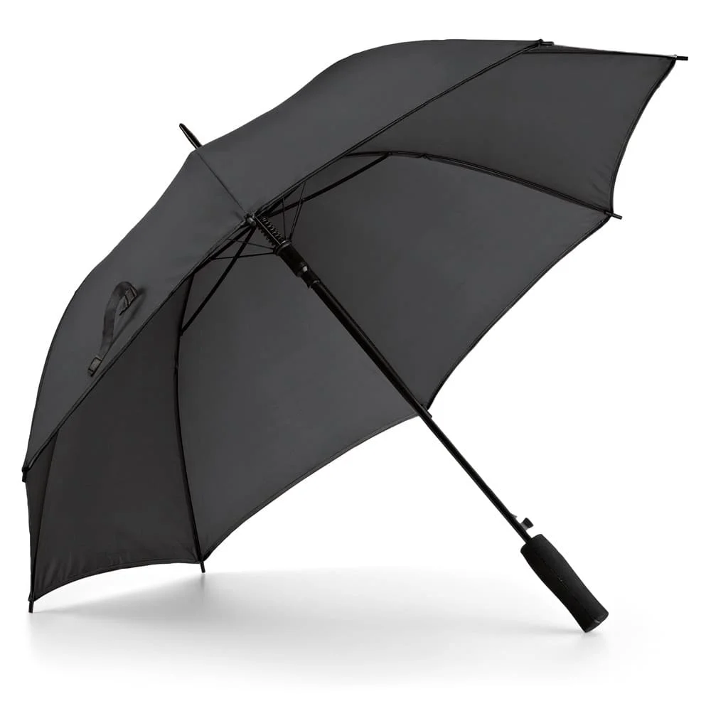 Guarda-chuva em poliéster 190T com pega em EVA e abertura automática. Detalhe com linha colorida no guarda-chuva e na pega