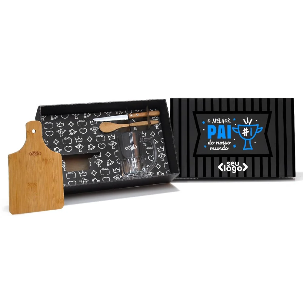 Kit caipirinha com tábua em Bambu, faca para frutas 4 em Inox/Bambu e colher de 18cm em Bambu e caneca em Vidro. Acomodados em uma linda caixa para presente. Capacidade da caneca: 340ml.